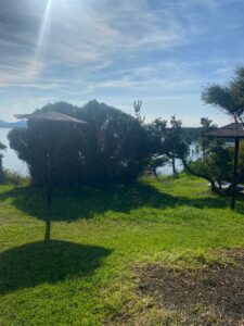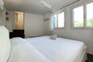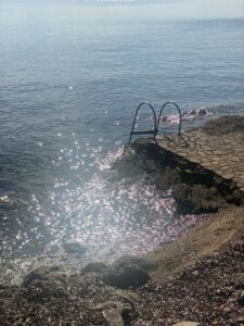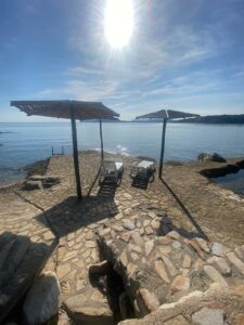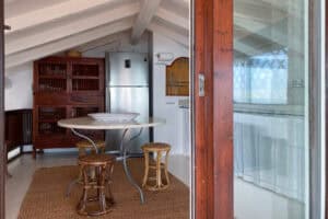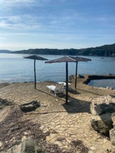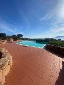 A staircase takes you to the upper floor, where you’ll find a fully equipped kitchen that opens up to a large terrace with breathtaking sea views. This outdoor space is a paradise for nature lovers, featuring a covered veranda perfect for al fresco dining and an uncovered area with sun loungers for sunbathing. The view embraces the beauty of the Gulf of Marinella, providing you with spectacular emotions.