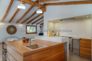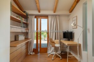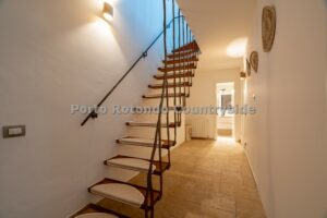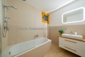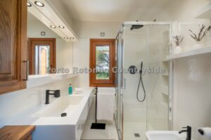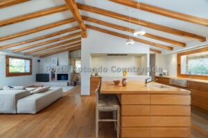 The main building: on the upper floor, after having crossed the elegant entrance, we are immediately welcomed into a single large room strongly characterized by the large central kitchen that opens onto the living area. A large and comfortable sofa and the characteristic wood-burning fireplace give the whole room a pleasant vocation for conviviality, without neglecting the elegance that distinguishes it. On the back of the kitchen is the pantry and a small guest bathroom with shower. The internal dining room, with a large table for 10 people, acts as a link between the living area and the sleeping area. Outside, at the rear of the house, a lovely covered veranda, furnished with a dining table for 10 and a comfortable sofa are the hub of conviviality during the warmer months. Finally, a small outdoor and panoramic fitness area contributes to making this villa truly Magic. The sleeping area on the upper floor consists of: 1 master double bedroom, with bathroom with shower and bathtub “en suite” and walk-in closet, 1 double bedroom with and bathroom with shower “en suite” and another double bedroom, bathroom with shower “en suite”. Each room is accessible from the inside but, in order to guarantee guests greater privacy and freedom, it also has its own independent entrance from the outside. Through a beautiful staircase, from the dining room we go down to the lower floor. Here we find a living and relaxation area that gives access to the 2 double bedrooms with a bathroom with shower / tub. Villa Magic is equipped with a highly efficient air conditioning system that allows you to live the house in absolute comfort 12 months a year.