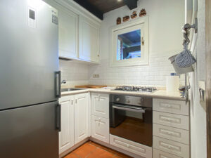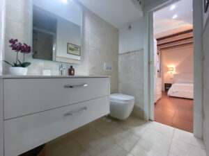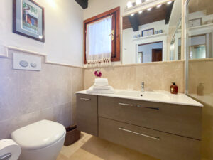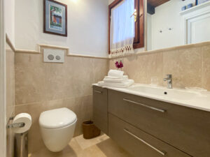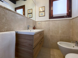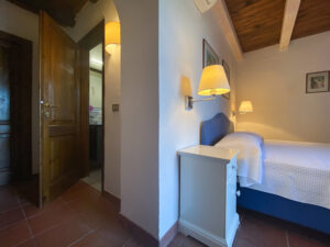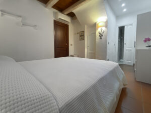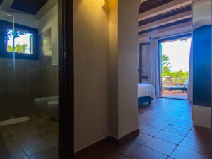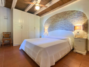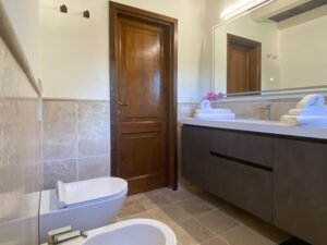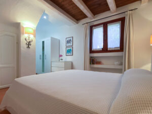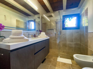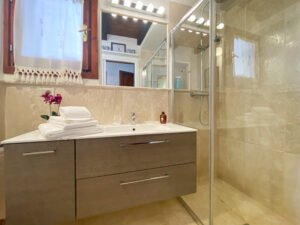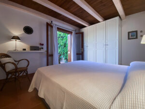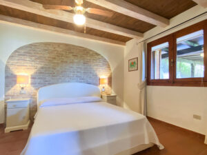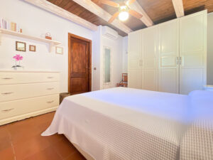 Una scala interna conduce al piano inferiore, che ospita altre due camere da letto, tra cui la camera padronale con bagno privato e terrazza privata con accesso diretto al giardino, e una seconda camera matrimoniale, anch’essa con bagno privato. Le due camere da letto al piano inferiore sono la soluzione ideale per i genitori che desiderano avere i loro due figli a portata di mano, lasciando la camera da letto al piano superiore per un’altra coppia di ospiti.