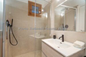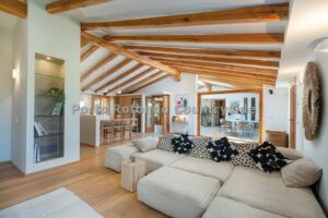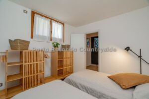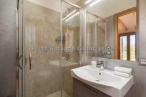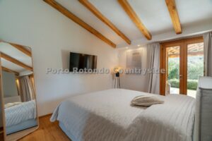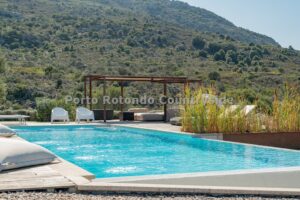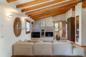 The main building: on the upper floor, after having crossed the elegant entrance, we are immediately welcomed into a single large room strongly characterized by the large central kitchen that opens onto the living area. A large and comfortable sofa and the characteristic wood-burning fireplace give the whole room a pleasant vocation for conviviality, without neglecting the elegance that distinguishes it. On the back of the kitchen is the pantry and a small guest bathroom with shower. The internal dining room, with a large table for 10 people, acts as a link between the living area and the sleeping area. Outside, at the rear of the house, a lovely covered veranda, furnished with a dining table for 10 and a comfortable sofa are the hub of conviviality during the warmer months. Finally, a small outdoor and panoramic fitness area contributes to making this villa truly Magic. The sleeping area on the upper floor consists of: 1 master double bedroom, with bathroom with shower and bathtub “en suite” and walk-in closet, 1 double bedroom with and bathroom with shower “en suite” and another double bedroom, bathroom with shower “en suite”. Each room is accessible from the inside but, in order to guarantee guests greater privacy and freedom, it also has its own independent entrance from the outside. Through a beautiful staircase, from the dining room we go down to the lower floor. Here we find a living and relaxation area that gives access to the 2 double bedrooms with a bathroom with shower / tub. Villa Magic is equipped with a highly efficient air conditioning system that allows you to live the house in absolute comfort 12 months a year.