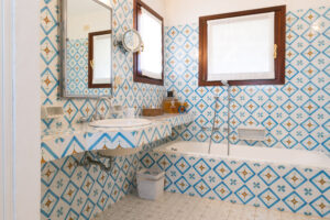 The villa is on two levels: on the ground floor you immediately enter in a large and very welcoming living area that overlooks the splendid veranda furnished with comfortable sofas and armchairs. Outside there is also a large dining table overlooking the beautiful garden. The fully equipped kitchen opens onto a further terrace with barbecue and serves the internal dining room. A small guest bathroom completes the living area. On the ground floor there is also a double bedroom with en suite bathroom and 2 other bedrooms with 2 single beds both with private bathrooms.